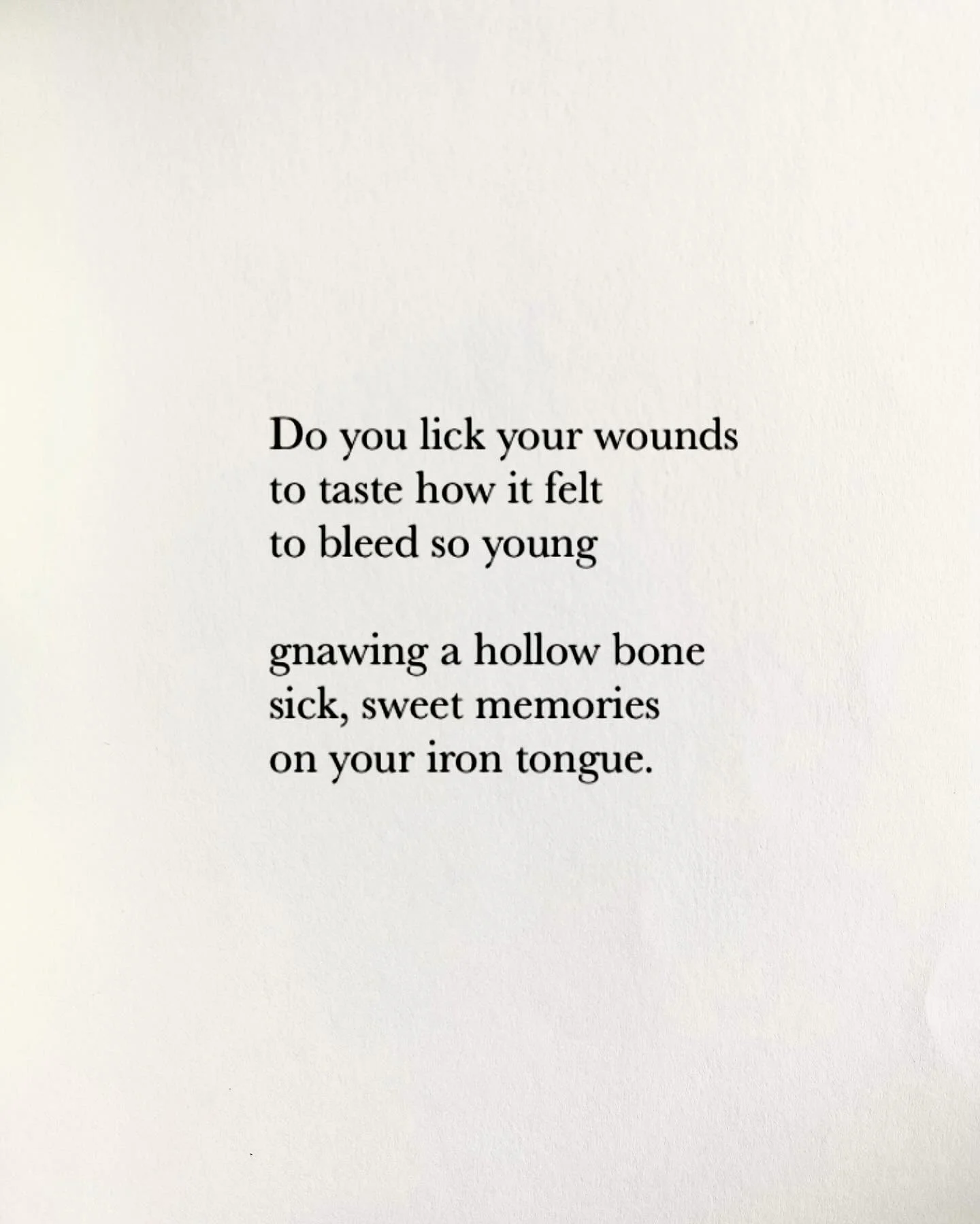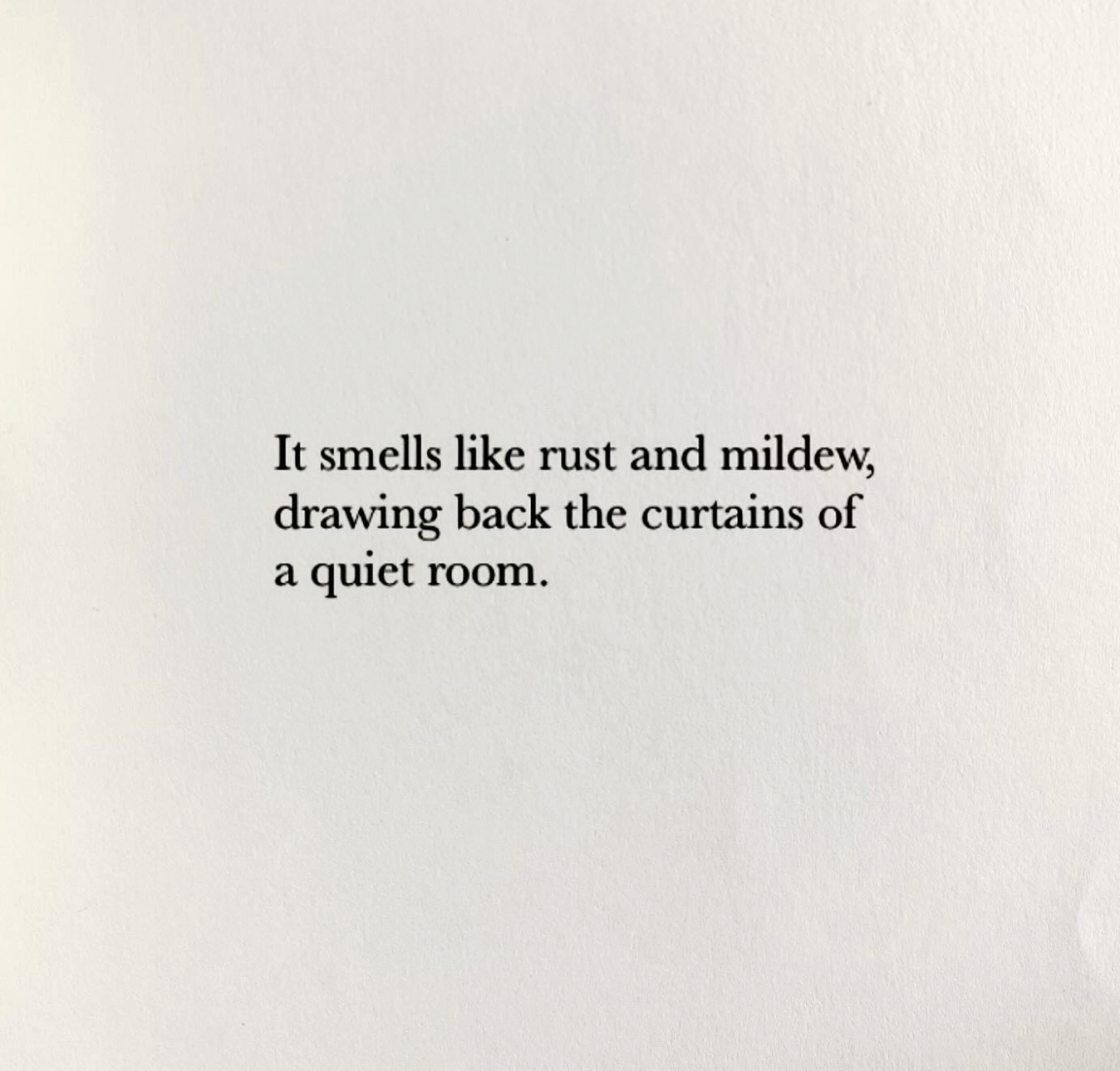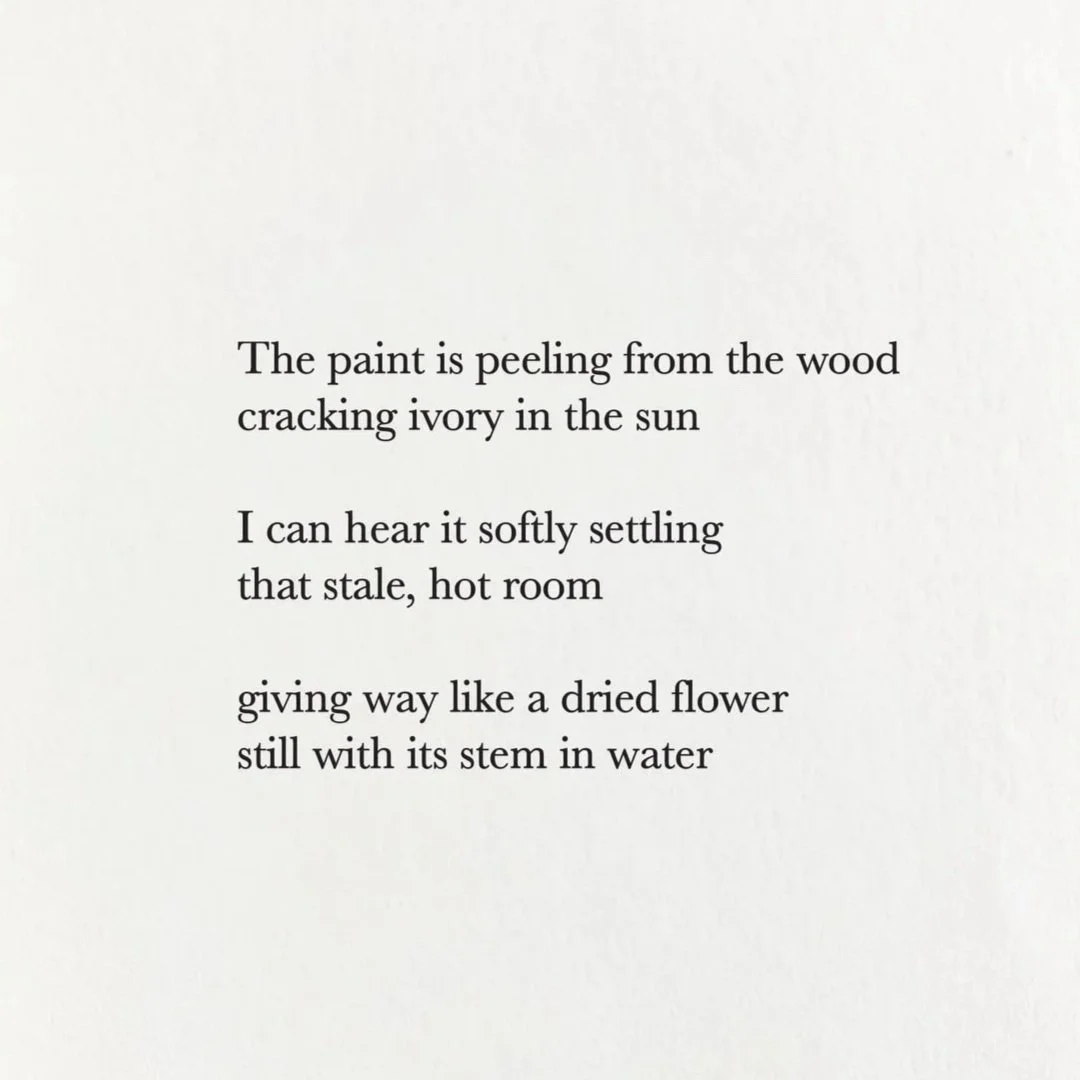 My most recent writing relies on found images paired with fragmented, single-sentences as visual poems; I like to imagine how the poem shifts when you read separate images in different orders and how the choice of typeface, imagery, and the image quality affects the perception of my words. In all my works I tend to write in free-verse fragments with hints of rhyme/rhythm placed throughout to expand on my ideas of longing, memory, and decay.